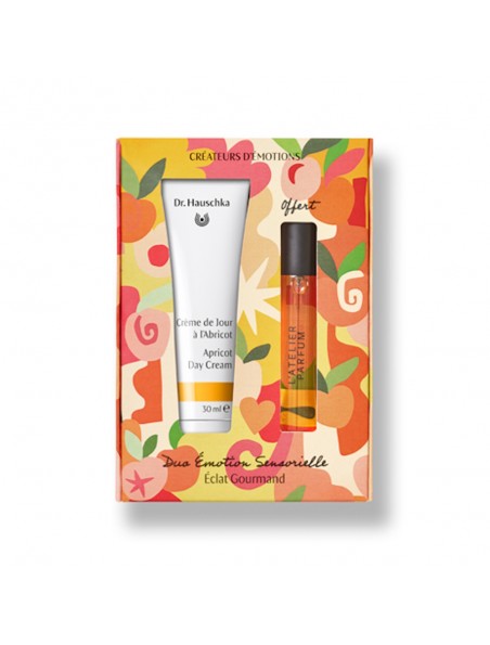 Le Duo Emotion Sensorielle Eclat Gourmand du laboratoire Dr Hauschka est composé d'une Crème de Jour à l'Abricot 30 ml et d'une Eau de Parfum Exquise Tentation de 10 ml offerte.