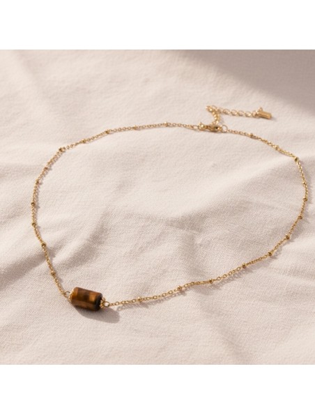 Le Collier Oeil du Tigre est un bijou de quartz chatoyant aux teintes dorées avec une pierre dure et opaque.