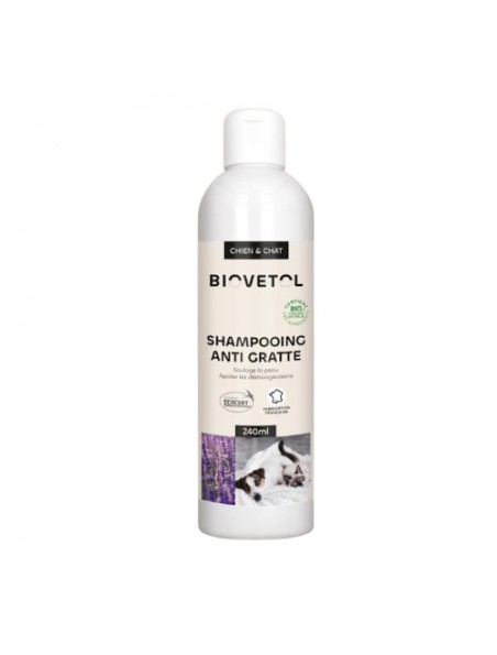 Description : Le Shampooing Anti-Gratte Bio du laboratoire Biovetol est un soin permettant une solution apaisante optimale des chats et des chiens.