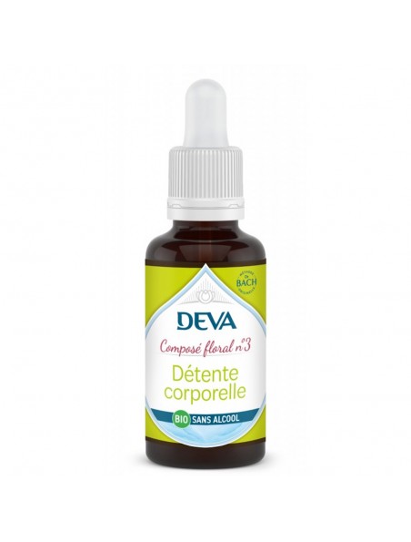 Détente Corporelle n°3 Sans Alcool Bio du laboratoire Deva s'utilise avant et après l'effort pour favoriser l'élimination, l'assouplissement corporel et l'élasticité.