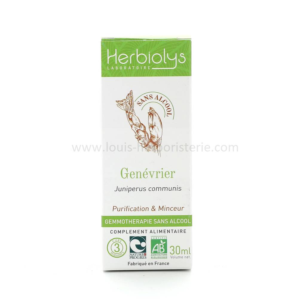 Le macérât de jeunes pousses fraîches de Genévrier Sans Alcool Bio du laboratoire Herbiolys permet de nettoyer l'organisme et d'agir sur la surcharge pondérale.